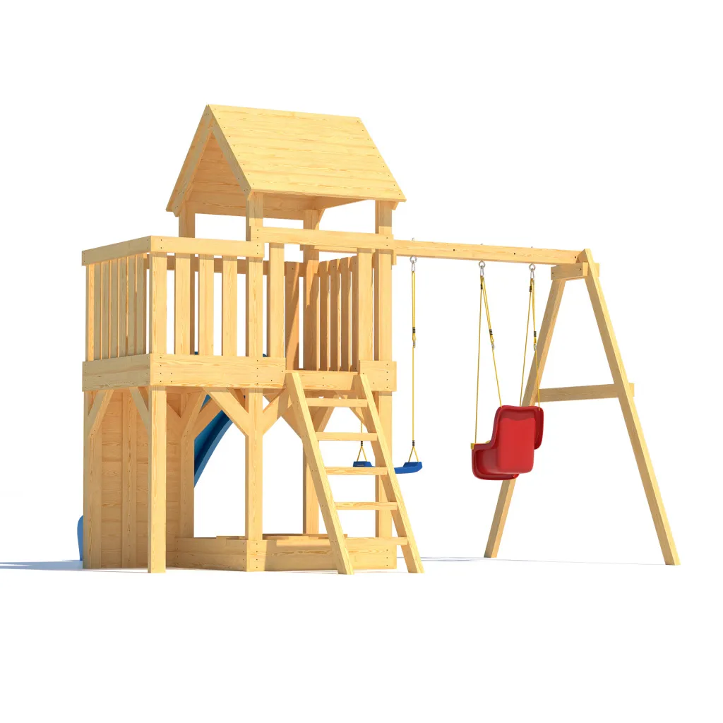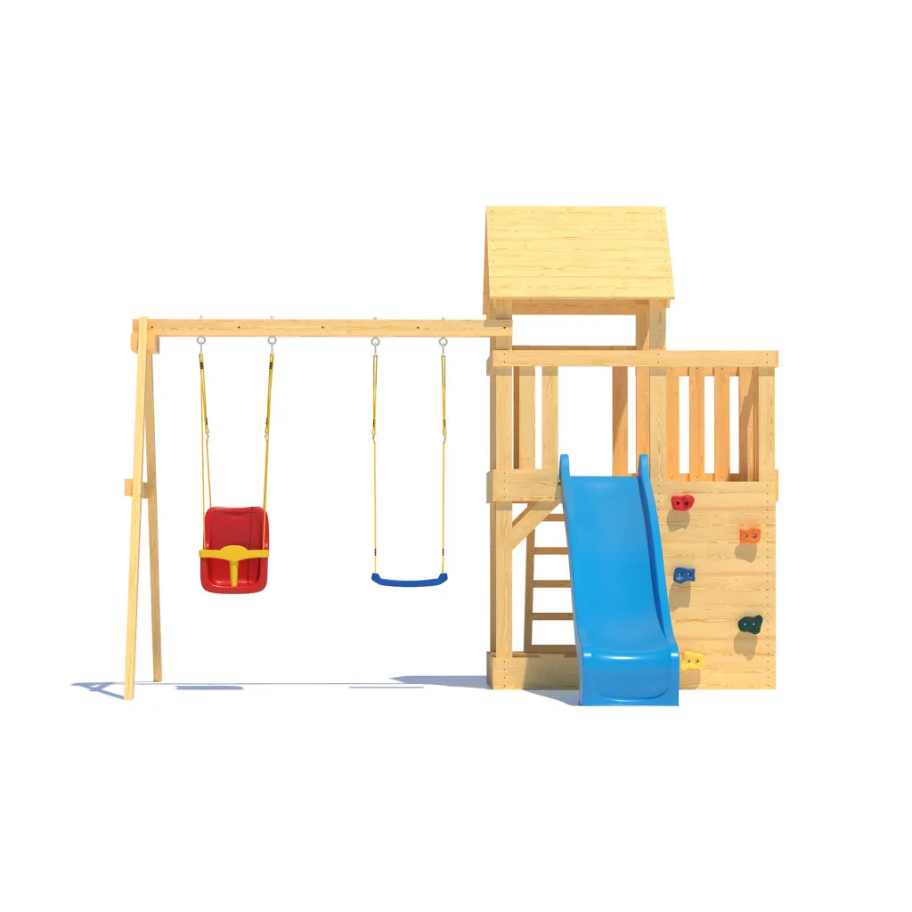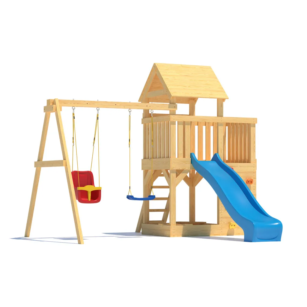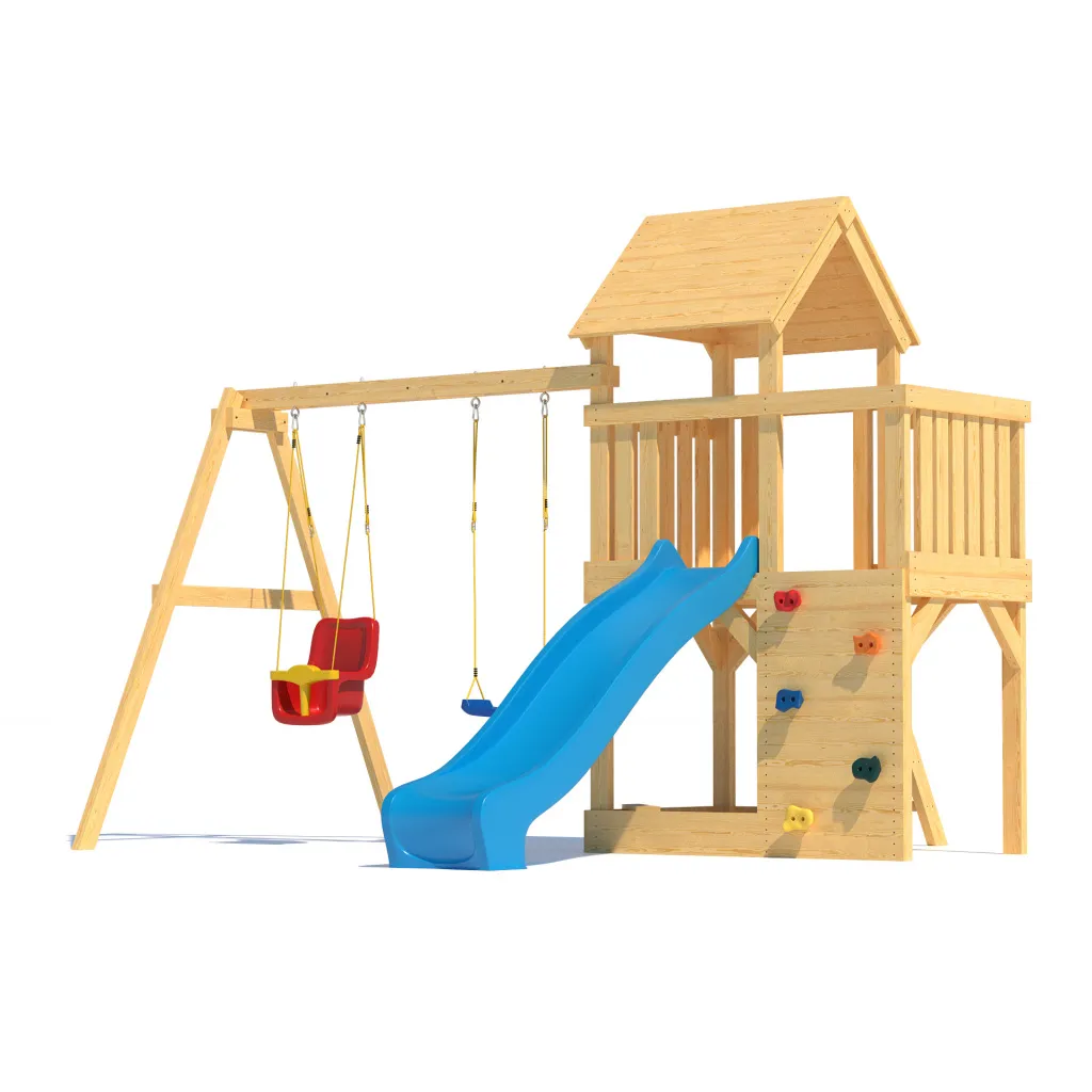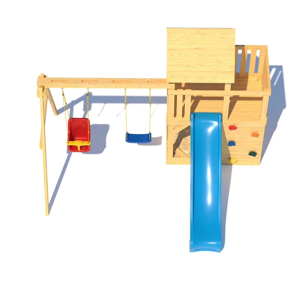• Комплектация: деревянный игровой домик с увеличенной игровой площадью, деревянная крыша,качельная балка, песочница с сиденьями, горка пластиковая двухслойная с двойной волной 2200 мм (Бельгия), качели лодочка - 1 шт (Бельгия), качели со спинкой LUXE ( Бельгия), скалодром, шаблон для сверления отверстий, инструкция по сборке