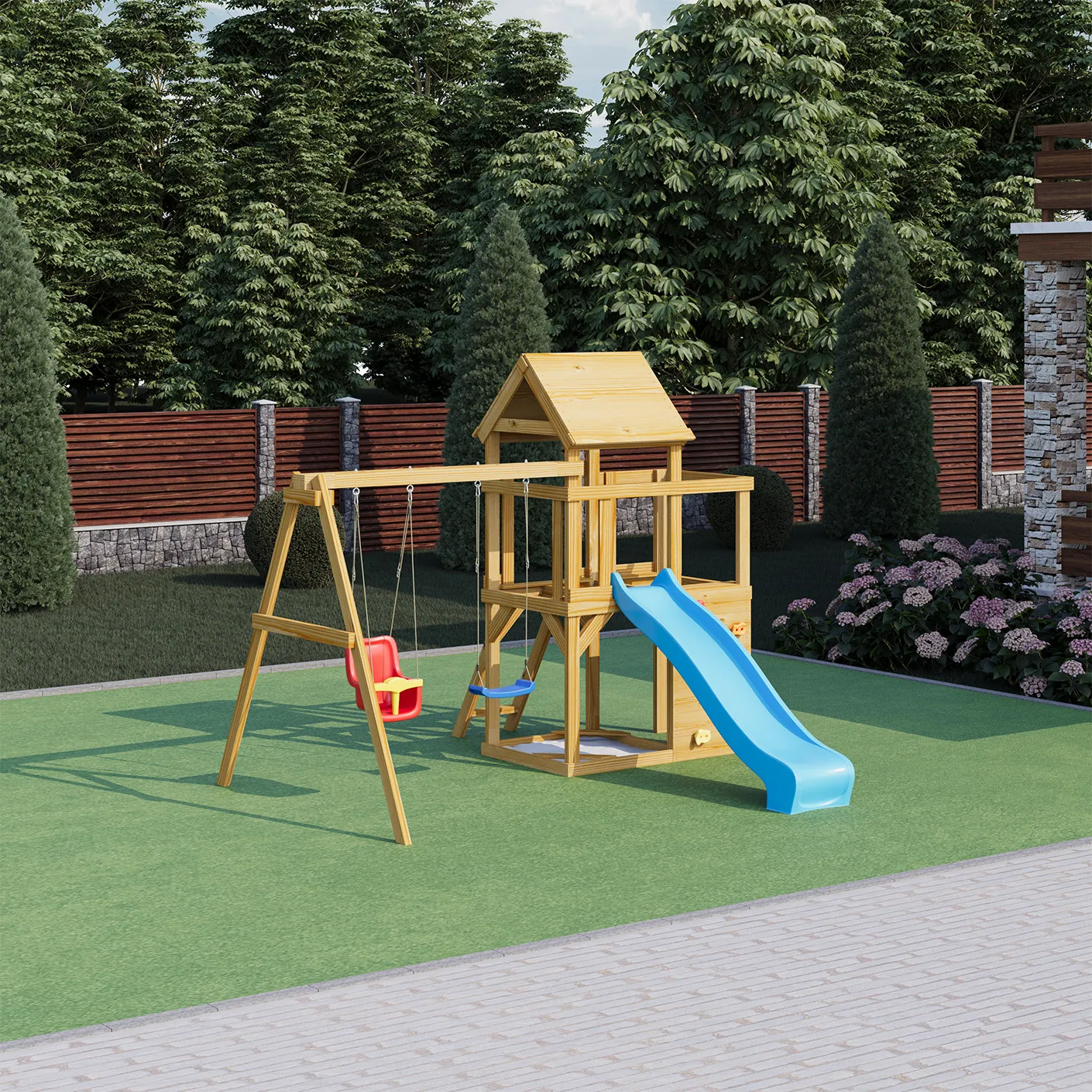 Детская деревянная игровая площадка для улицы дачи Scout S3 с деревянной крышей