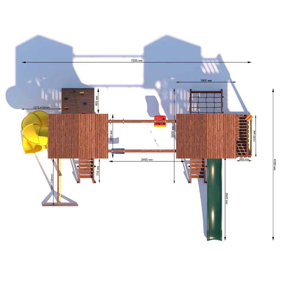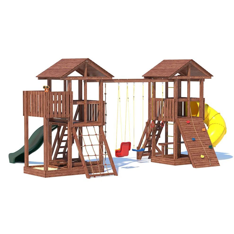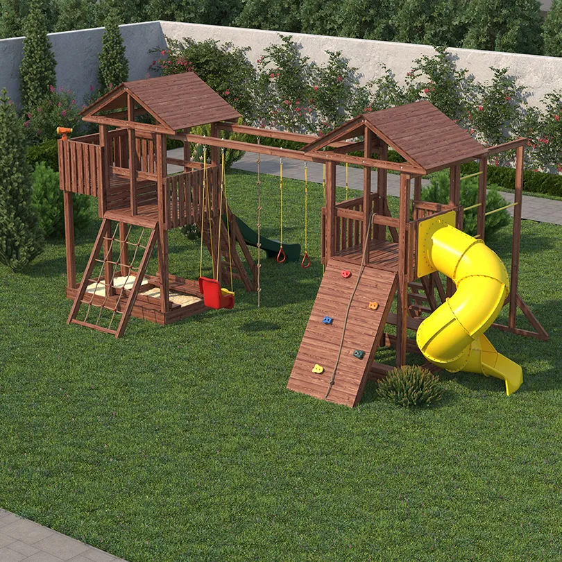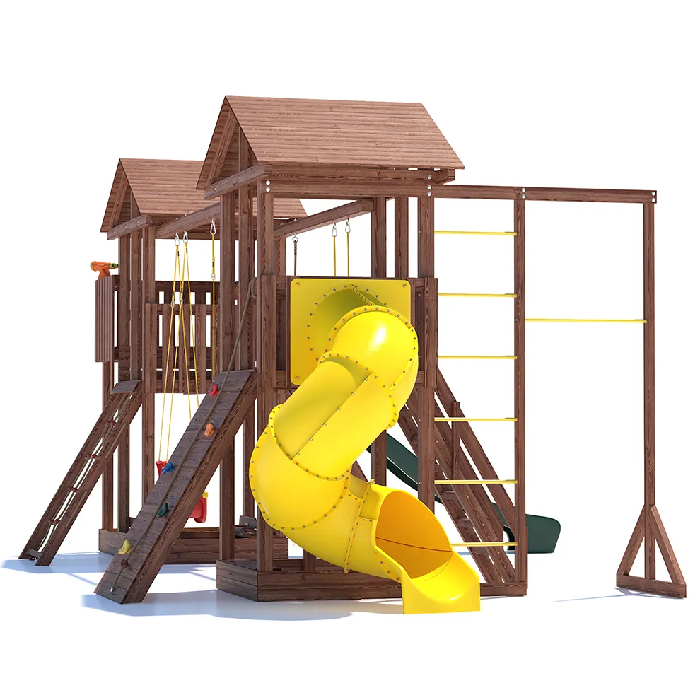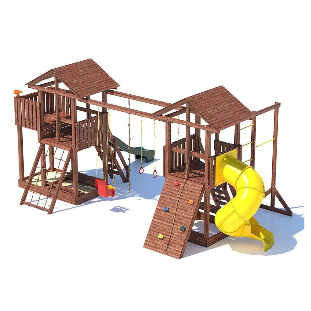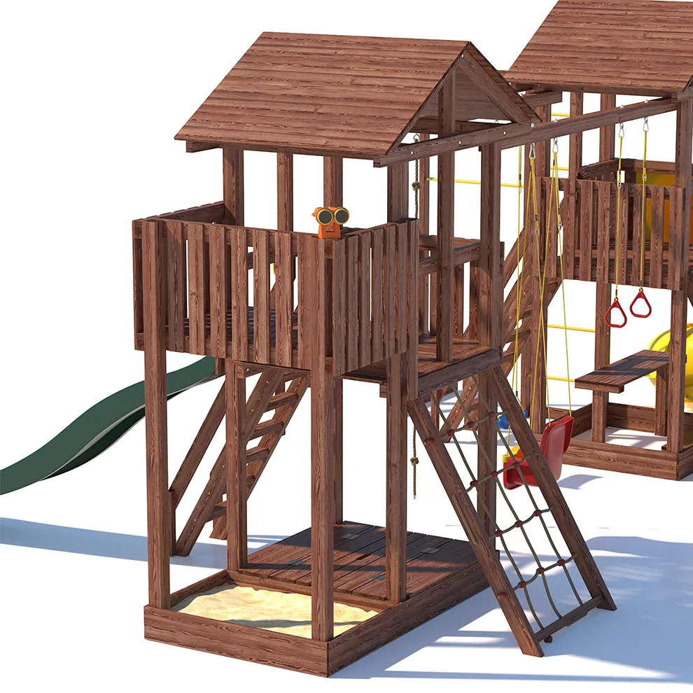 Комплексы серии Active созданы для активного отдыха Вашего ребенка с упором на спортивные элементы, разработаны и изготовлены на платформе высотой 1,5м., элементы несущей конструкции выполнены из высококачественного клееного бруса 90х90мм. Данная модель игрового комплекса оборудована богатым набором игровых элементов для веселых игр и развлечений. Основу конструкции составляют два игровых домика- один c просторным балконом, двухволновой горкой длиной 3 метра с подключением к воде и закрывающейся песочницей, а другой с высоким скалодромом, столиком внизу и винтовой горкой, которая несомненно станет местом всеобщего детского притяжения! Комплекс надежен и универсален, он создан для активного и безопасного развлечения детей.