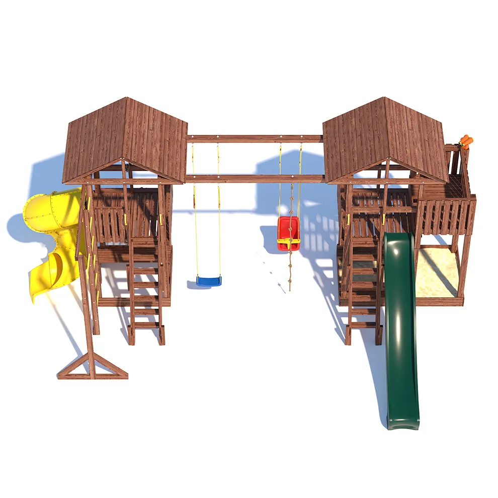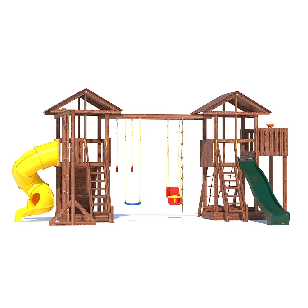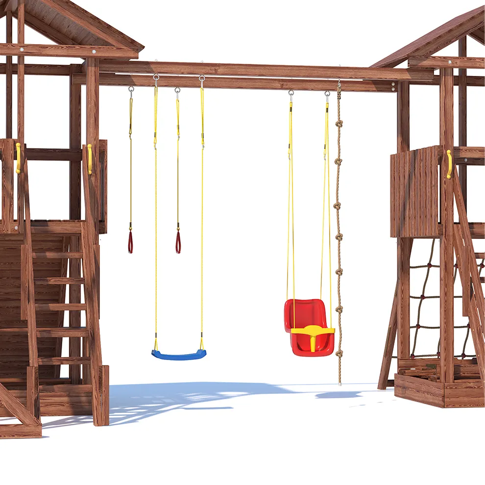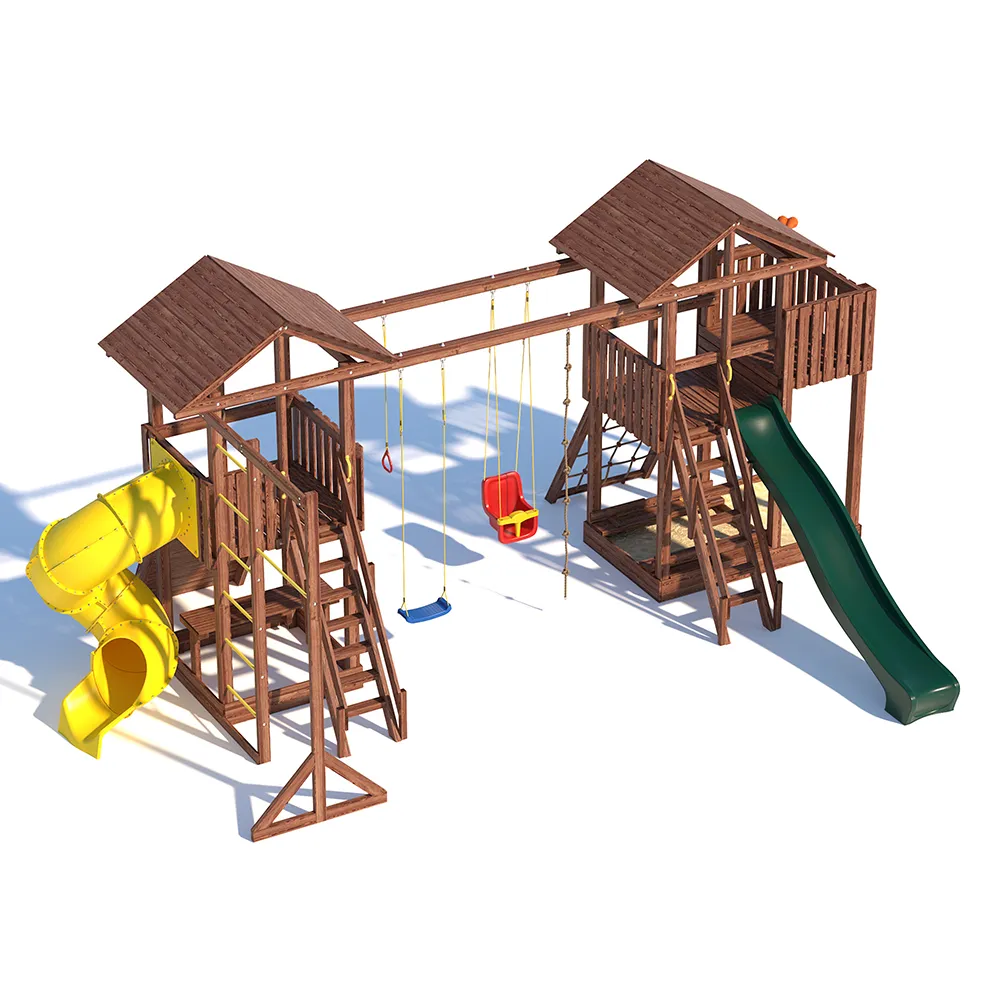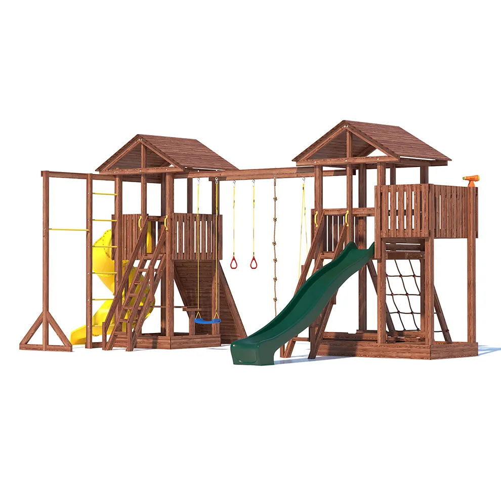 Комплексы серии Active созданы для активного отдыха Вашего ребенка с упором на спортивные элементы, разработаны и изготовлены на платформе высотой 1,5м., элементы несущей конструкции выполнены из высококачественного клееного бруса 90х90мм. Данная модель игрового комплекса оборудована богатым набором игровых элементов для веселых игр и развлечений. Основу конструкции составляют два игровых домика- один c просторным балконом, двухволновой горкой длиной 3 метра с подключением к воде и закрывающейся песочницей, а другой с высоким скалодромом, столиком внизу и винтовой горкой, которая несомненно станет местом всеобщего детского притяжения! Комплекс надежен и универсален, он создан для активного и безопасного развлечения детей.
