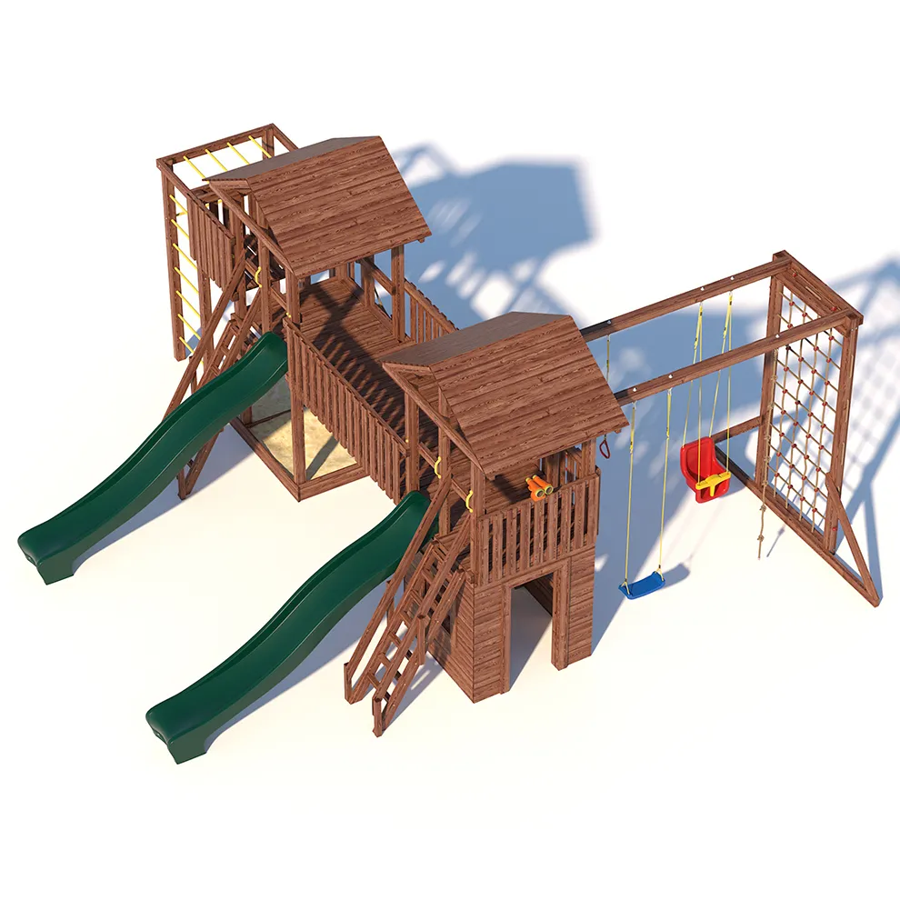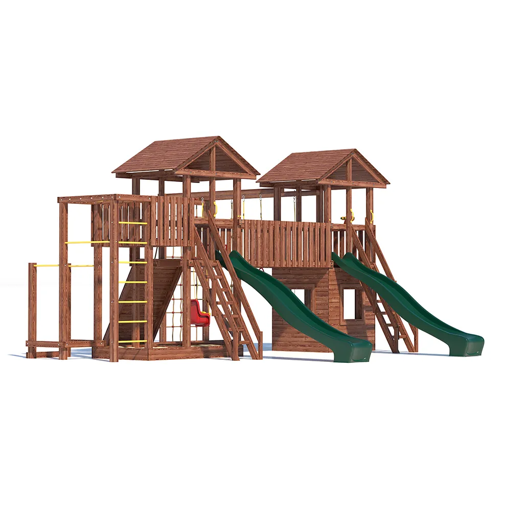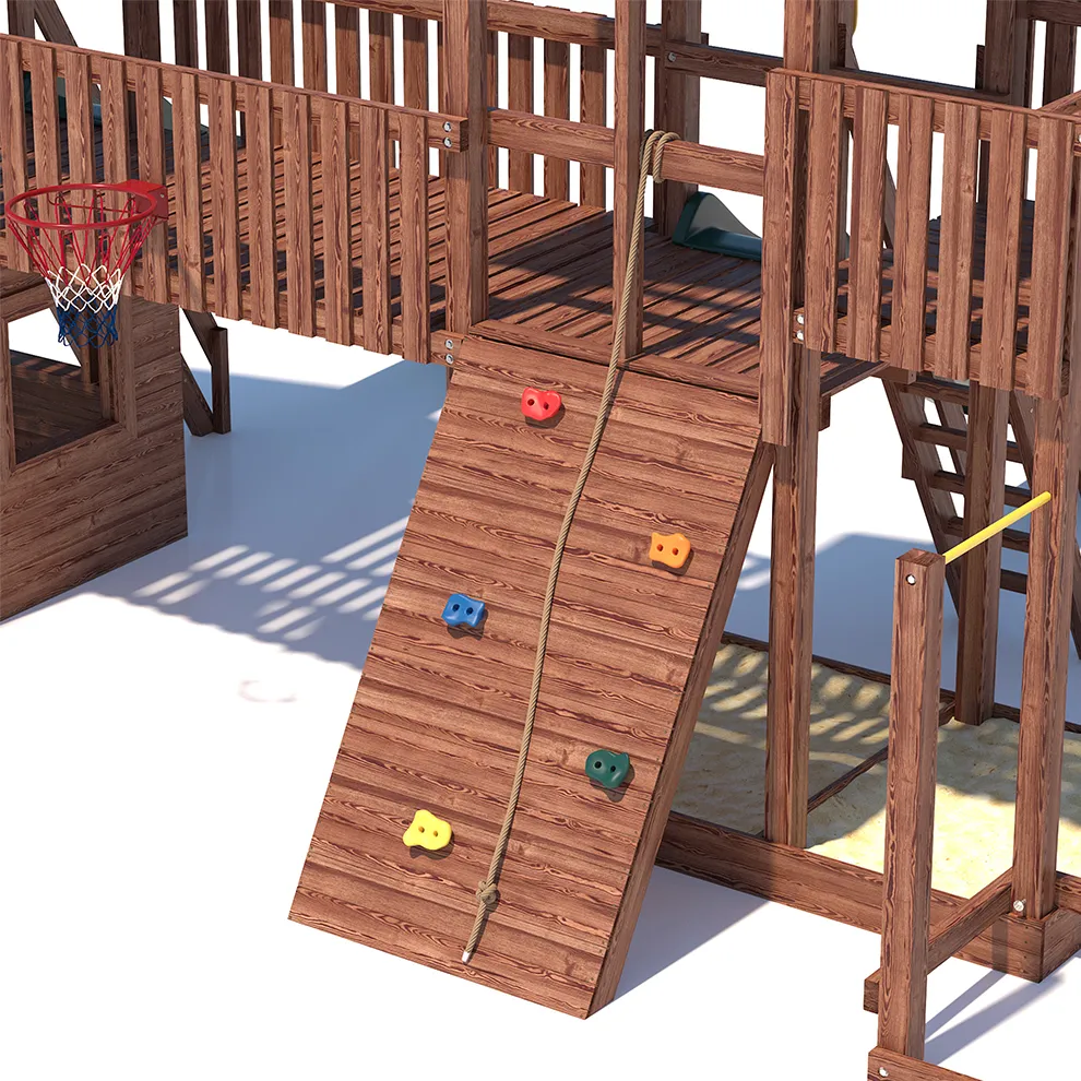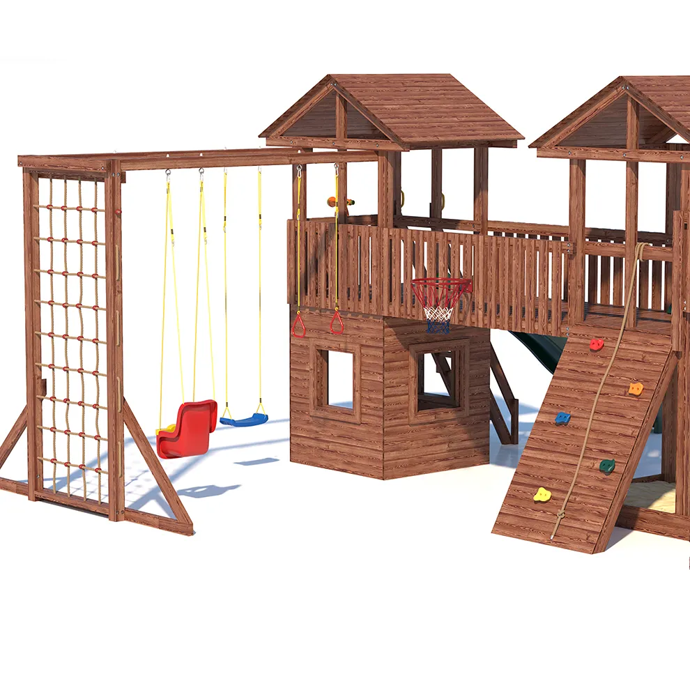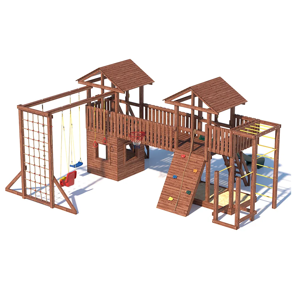 Комплексы серии Active созданы для активного отдыха Вашего ребенка с упором на спортивные элементы, разработаны и изготовлены на платформе высотой 1,5м., элементы несущей конструкции выполнены из высококачественного клееного бруса 90х90мм. Данная модель игрового комплекса оборудована богатым набором игровых элементов для веселых игр и развлечений.Основу конструкции составляют два игровых домика-один закрытый обшитый, а второй с просторным балконом и песочницей, соединенных между собой большим переходным мостиком. Игровые элементы комплекса это- две большие трехметровые горки с двойной волной и подключением к воде, на которых можно кататься наперегонки, качели-лодочка, качели со спинкой и фиксатором для малышей, рукоход, баскетбольное кольцо, высокая вертикальная сетка-лазалка, канат, гимнастические кольца, турник и брусья. Комплекс надежен и универсален, он создан для активного и безопасного развлечения детей.