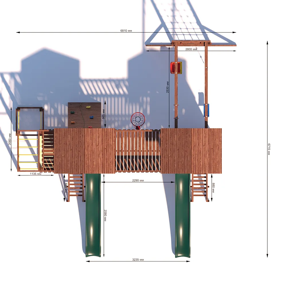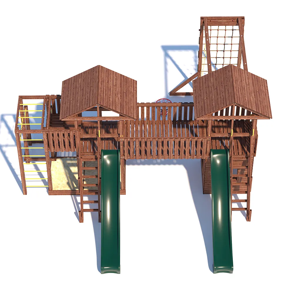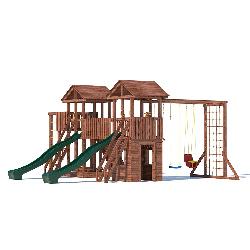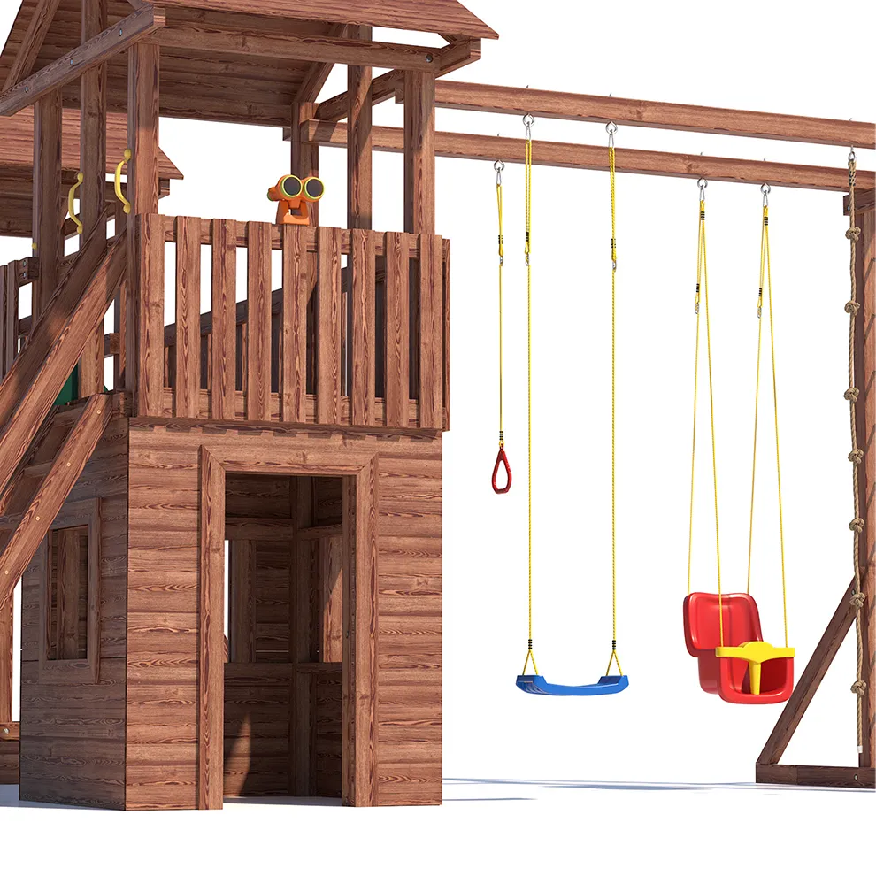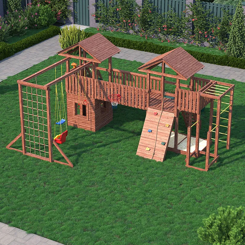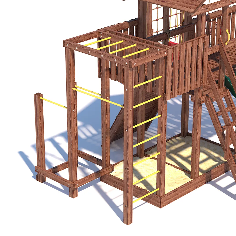 Комплексы серии Active созданы для активного отдыха Вашего ребенка с упором на спортивные элементы, разработаны и изготовлены на платформе высотой 1,5м., элементы несущей конструкции выполнены из высококачественного клееного бруса 90х90мм. Данная модель игрового комплекса оборудована богатым набором игровых элементов для веселых игр и развлечений.Основу конструкции составляют два игровых домика-один закрытый обшитый, а второй с просторным балконом и песочницей, соединенных между собой большим переходным мостиком. Игровые элементы комплекса это- две большие трехметровые горки с двойной волной и подключением к воде, на которых можно кататься наперегонки, качели-лодочка, качели со спинкой и фиксатором для малышей, рукоход, баскетбольное кольцо, высокая вертикальная сетка-лазалка, канат, гимнастические кольца, турник и брусья. Комплекс надежен и универсален, он создан для активного и безопасного развлечения детей.