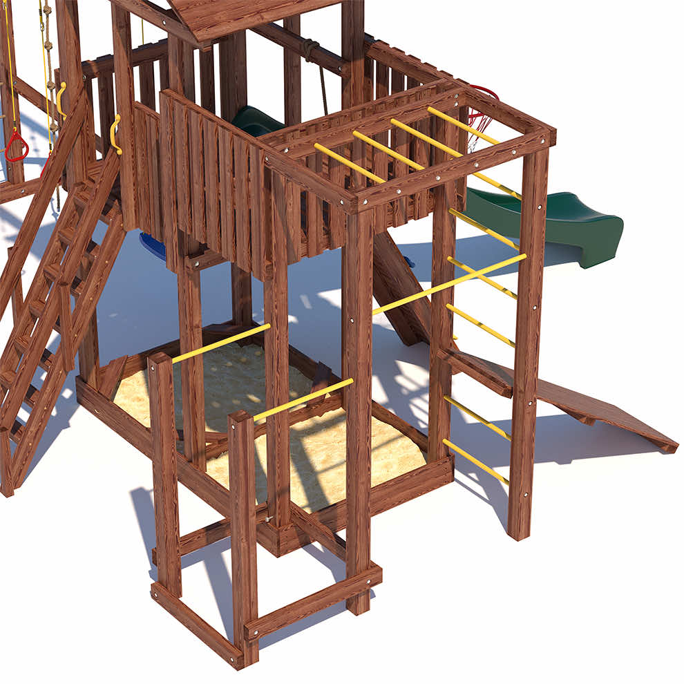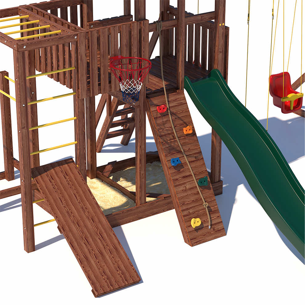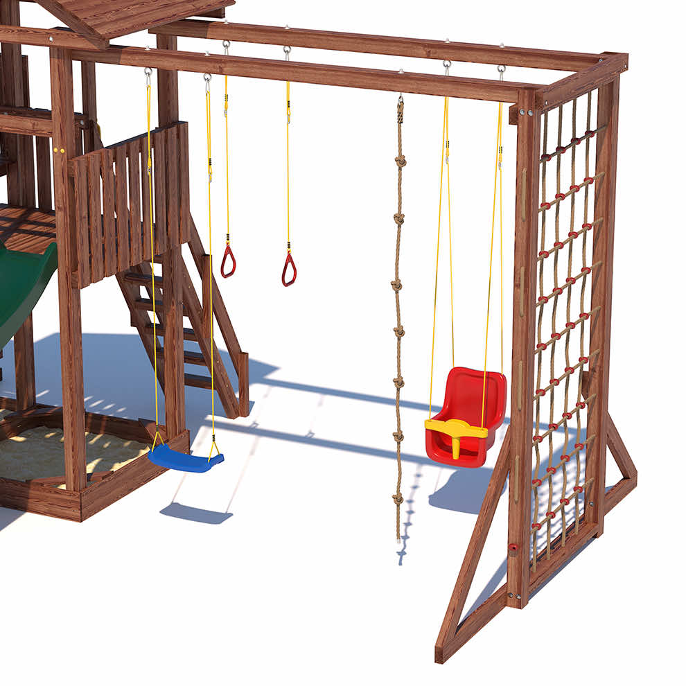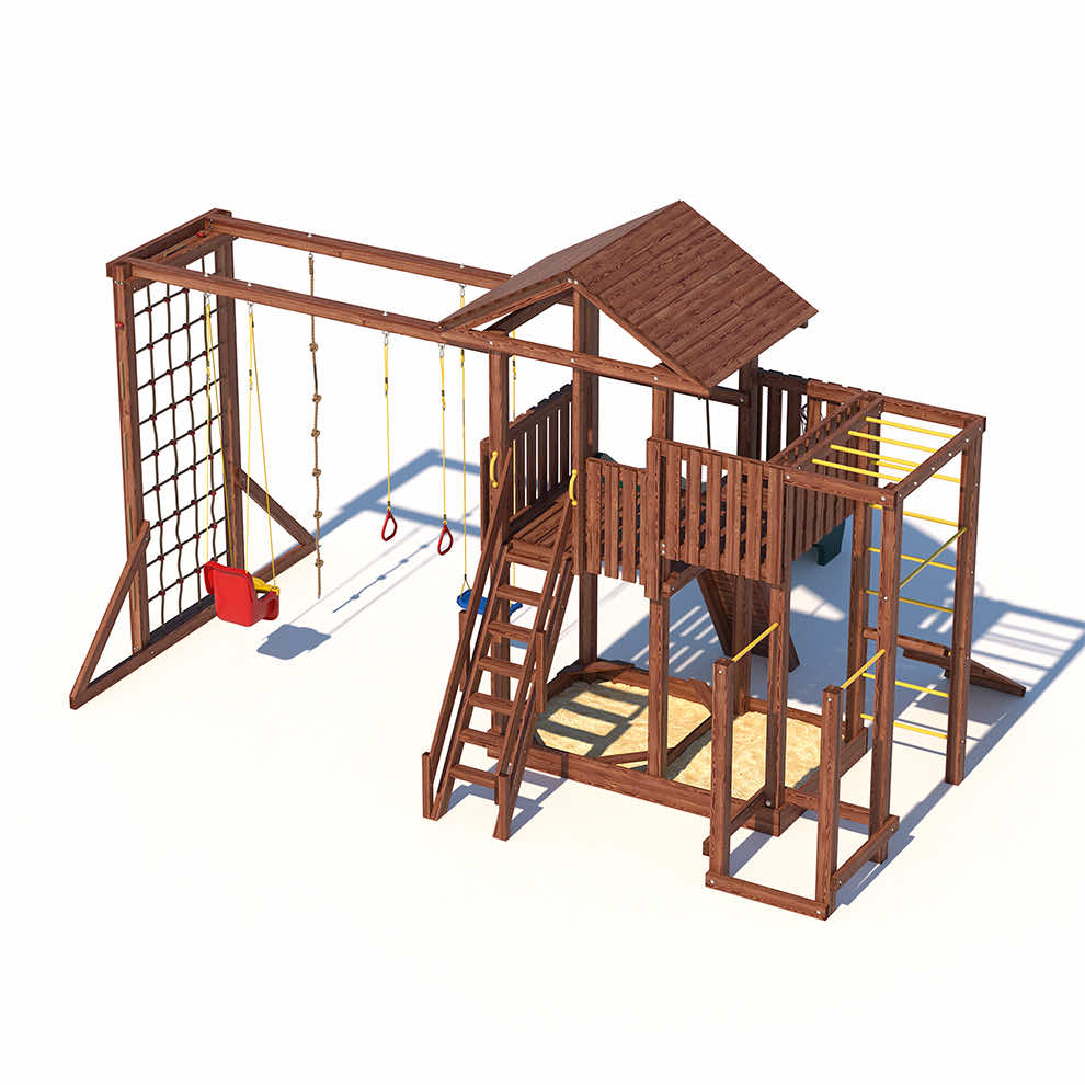 Комплексы серии Active созданы для активного отдыха Вашего ребенка с упором на спортивные элементы, разработаны и изготовлены на платформе высотой 1,5м., элементы несущей конструкции выполнены из высококачественного клееного бруса 90х90мм. Данная модель закроет потребности в спорте и отдыхе для разных категорий ребят. Малышам придутся по душе удобные качельки со спинкой , песочница с сиденьями, большая сетка -лазалка. Площадка оборудована удобными широкими ступеньками и перилами для безопасности. Ребятам постарше будет интересно на турнике и брусьях, рукоходе, а на специальной скамье для пресса можно запросто устроить настоящие спортивные соревнования.