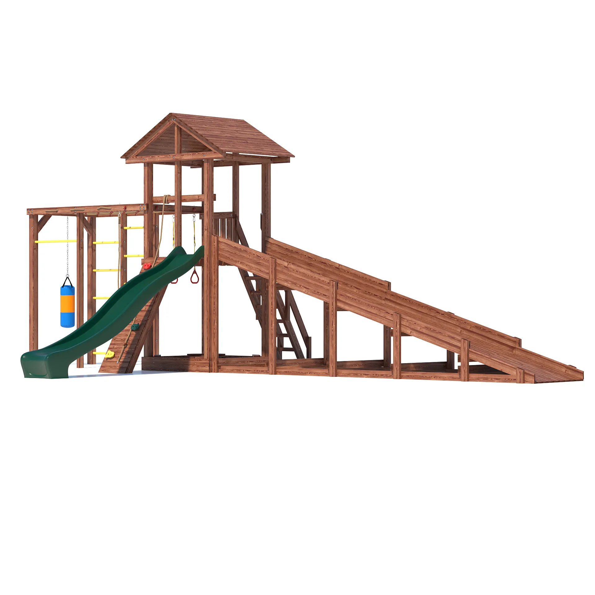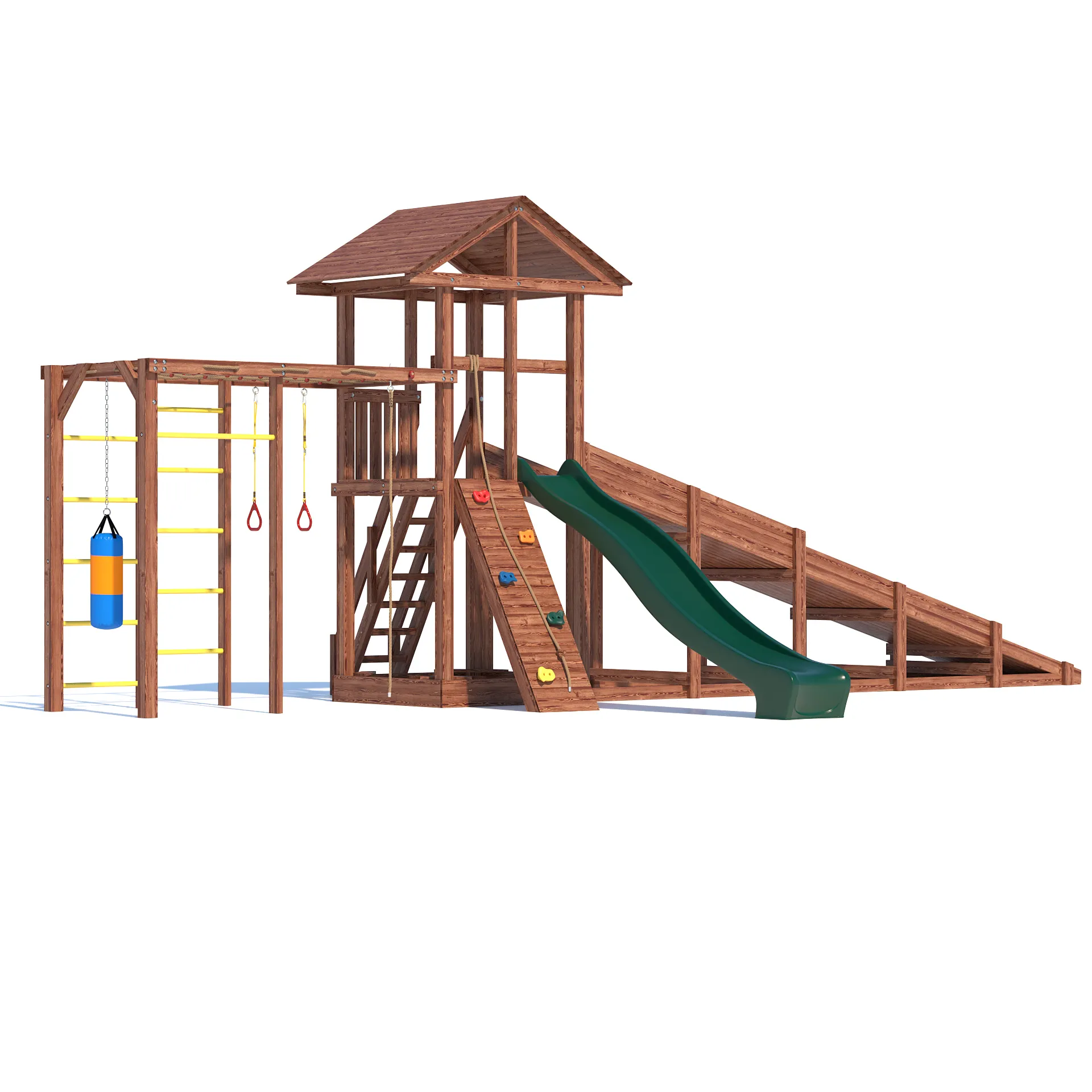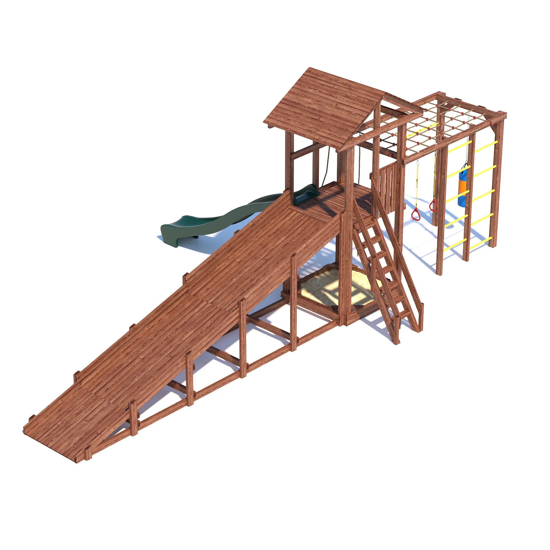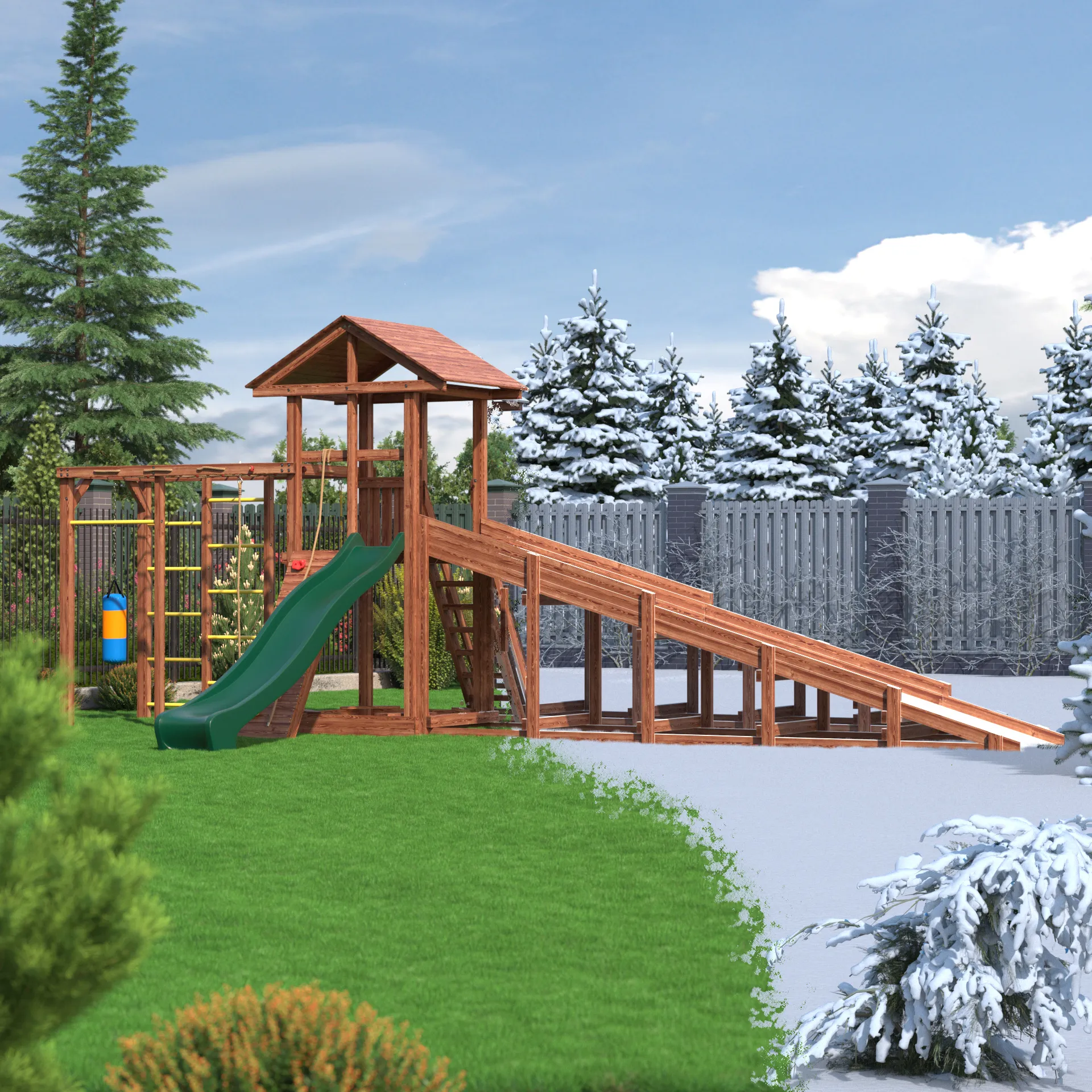Детский всесезонный деревянный спортивный комплекс “All Season 4” - это идеальное решение для активного времяпровождения вашего ребенка на улице в любую погоду. Благодаря качественным материалам и продуманной конструкции, комплекс станет излюбленным местом для игр и занятий спортом ваших детей круглый год. Он включает в себя большую пластиковую горку с подключением к воде, уютную песочницу с сиденьями для малышей, гимнастическую секцию с сеткой-лазалкой, канатом, гимнастическими кольцами, турником и боксерской грушей, а так же зимний заливной скат длиной 5 метров!