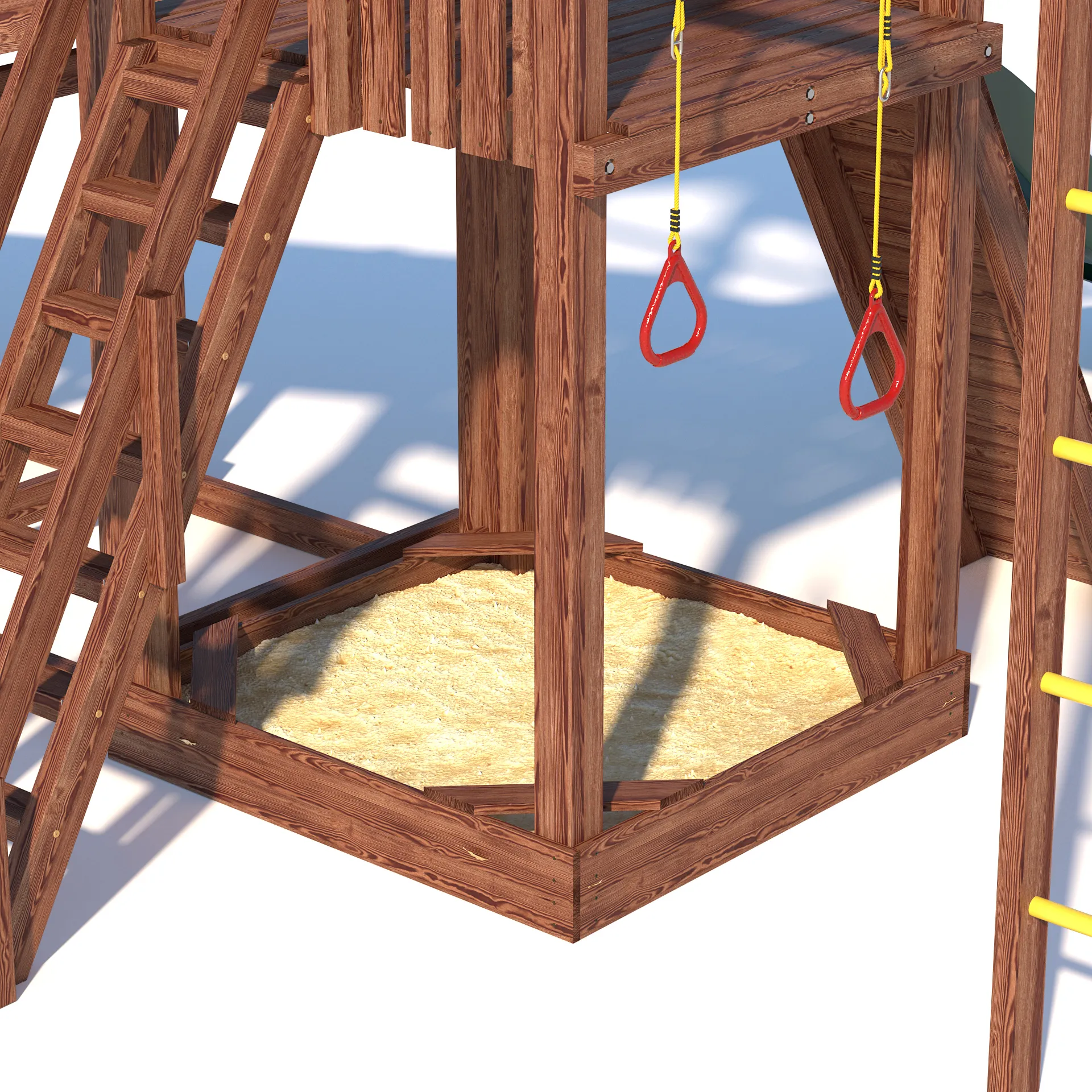Стропила и конек крыши, усилитель настила пола, дополнительная верхняя обвязка стоек игрового домика - выполнены из конструкционного бруса сечением 45*90 мм - это дает повышенную прочность и устойчивость конструкции.